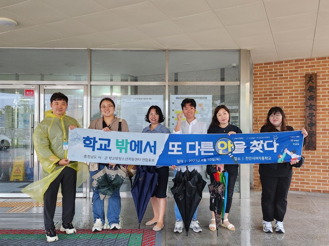 이번 연합홍보는 천안중학교(1고사장), 천안월봉중학교(2고사장), 천안서여자중학교(3고사장)에서 진행되었습니다. 비바람을 뚫고 청소년들을 위해 함께해주신 도, 시•군 학교밖청소년지원센터 선생님들, 꿈을 향해 한 걸음 더 나아가고자 열심히 준비한 청소년 친구들 모두 수고 많으셨습니다. 앞으로도 청소년들의 용기 있는 도전과 꿈을 응원하겠습니다.