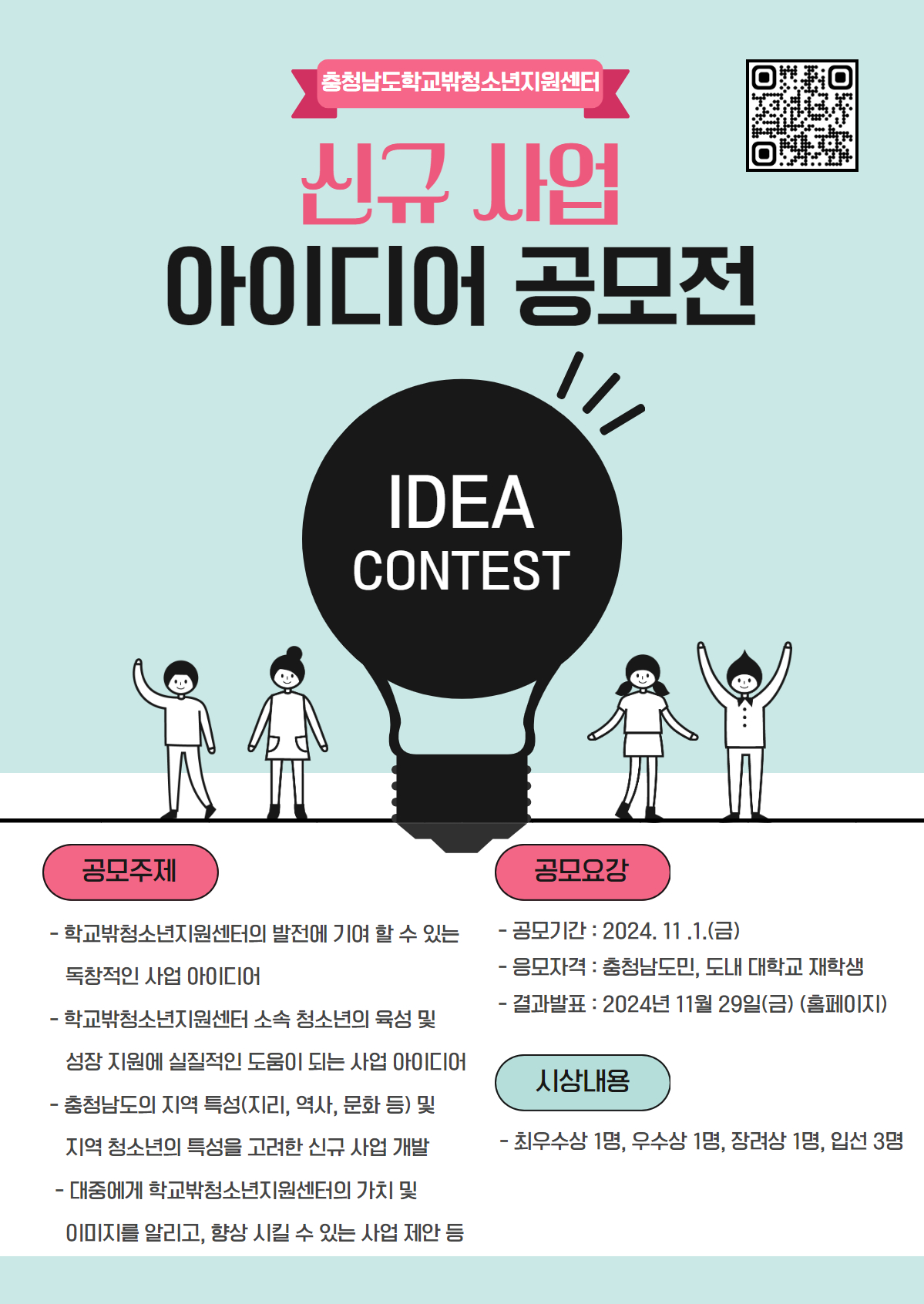 충청남도여성가족청소년사회서비스원(원장 조경훈) 충청남도학교밖청소년지원센터는 충청남도 학교 밖 청소년을 위한 ‘2025년 충남 학교 밖 청소년 지원 신규사업 아이디어 공모전’을 진행합니다.