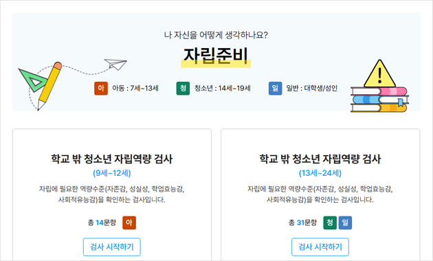청소년 지원 종합포털 청소년1388에서 다양한 심리검사를 제공합니다. 회원가입 없이 사용할 수 있어요. 필요한 경우 심리상담도 신청할 수 있어요.